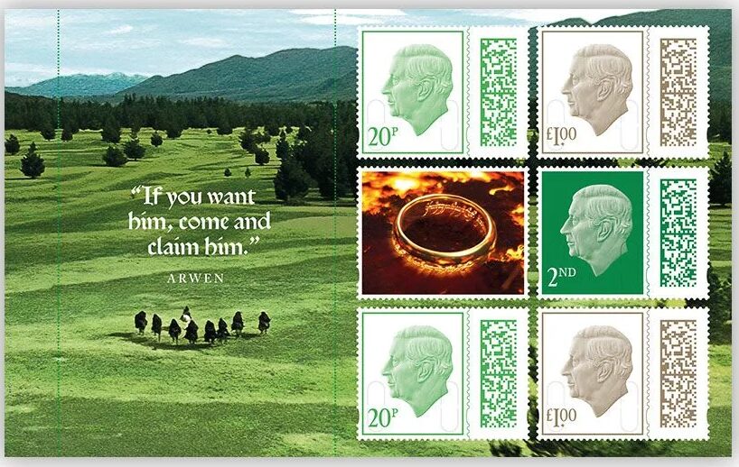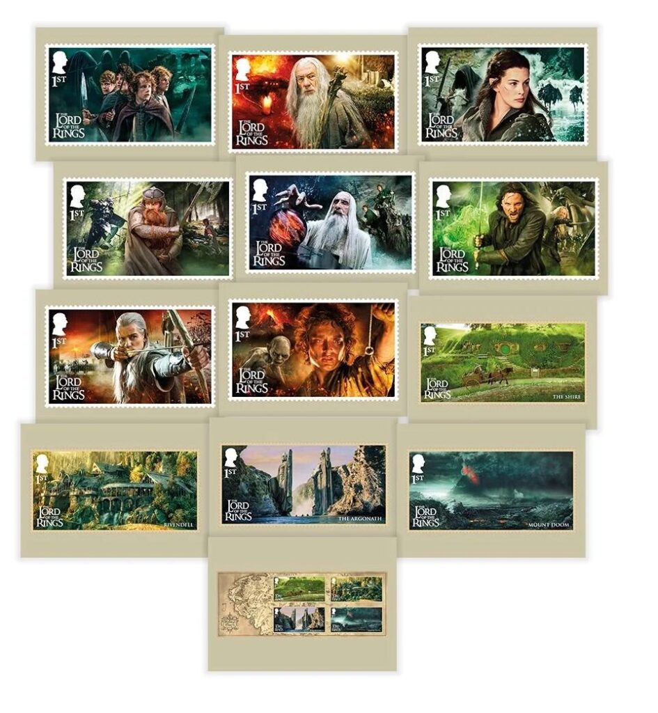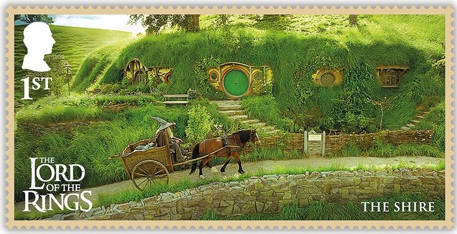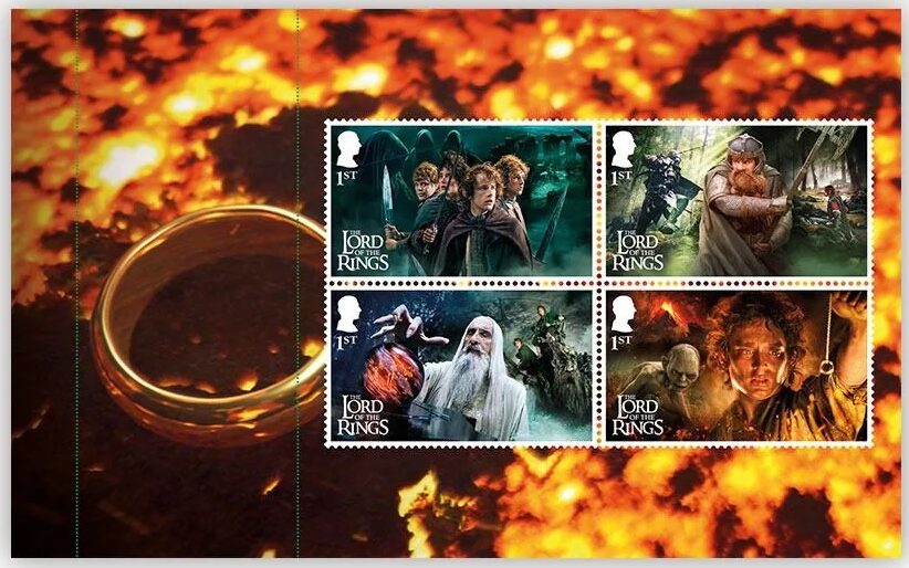 Along with the character stamps, there is a miniature sheet featuring four stamps. These focus on the iconic landscapes from the films, such as The Shire, Rivendell, and Mount Doom.