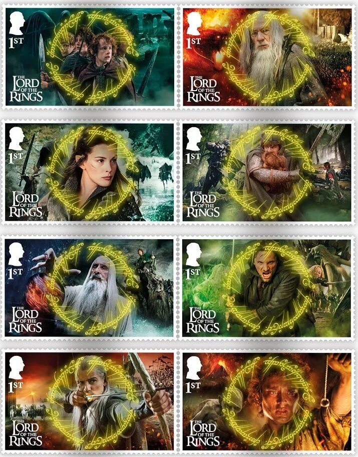 The main set features eight first-class stamps. They are printed in se-tenant pairs, which simply means they are joined together on the sheet even though they are different designs. The stamps feature a montage of characters like Gandalf, Frodo, and Aragorn, using images from the films.